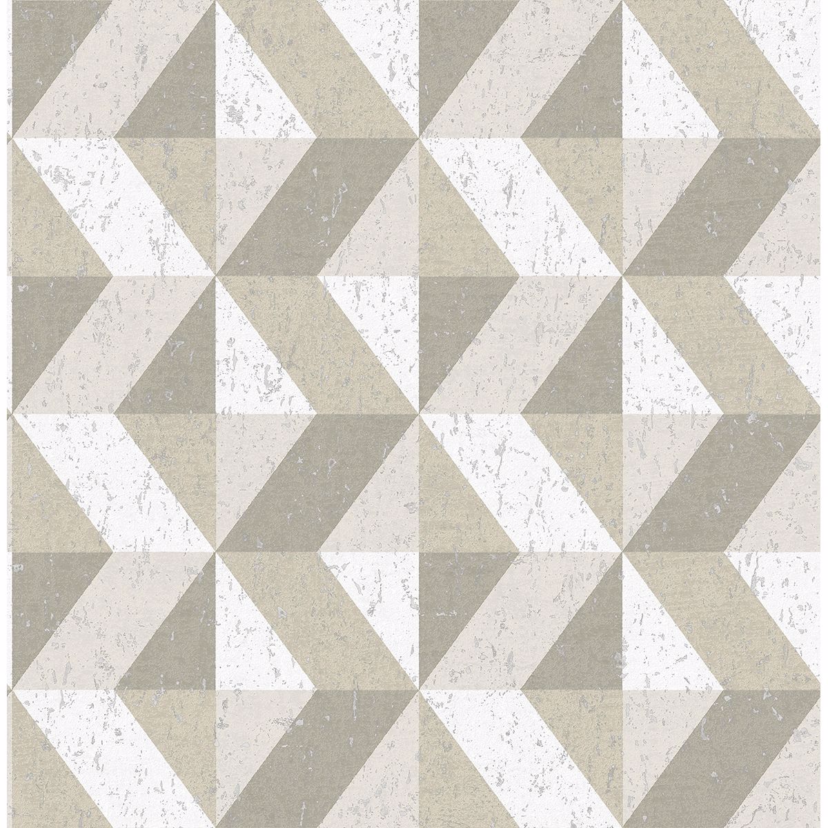 A dazzling platinum and taupe geometric pattern shimmers against an off white background in this industrial chic design. Textured elements and distressed accents lend to its concrete inspired look. Cerium is an unpasted, non woven wallpaper.