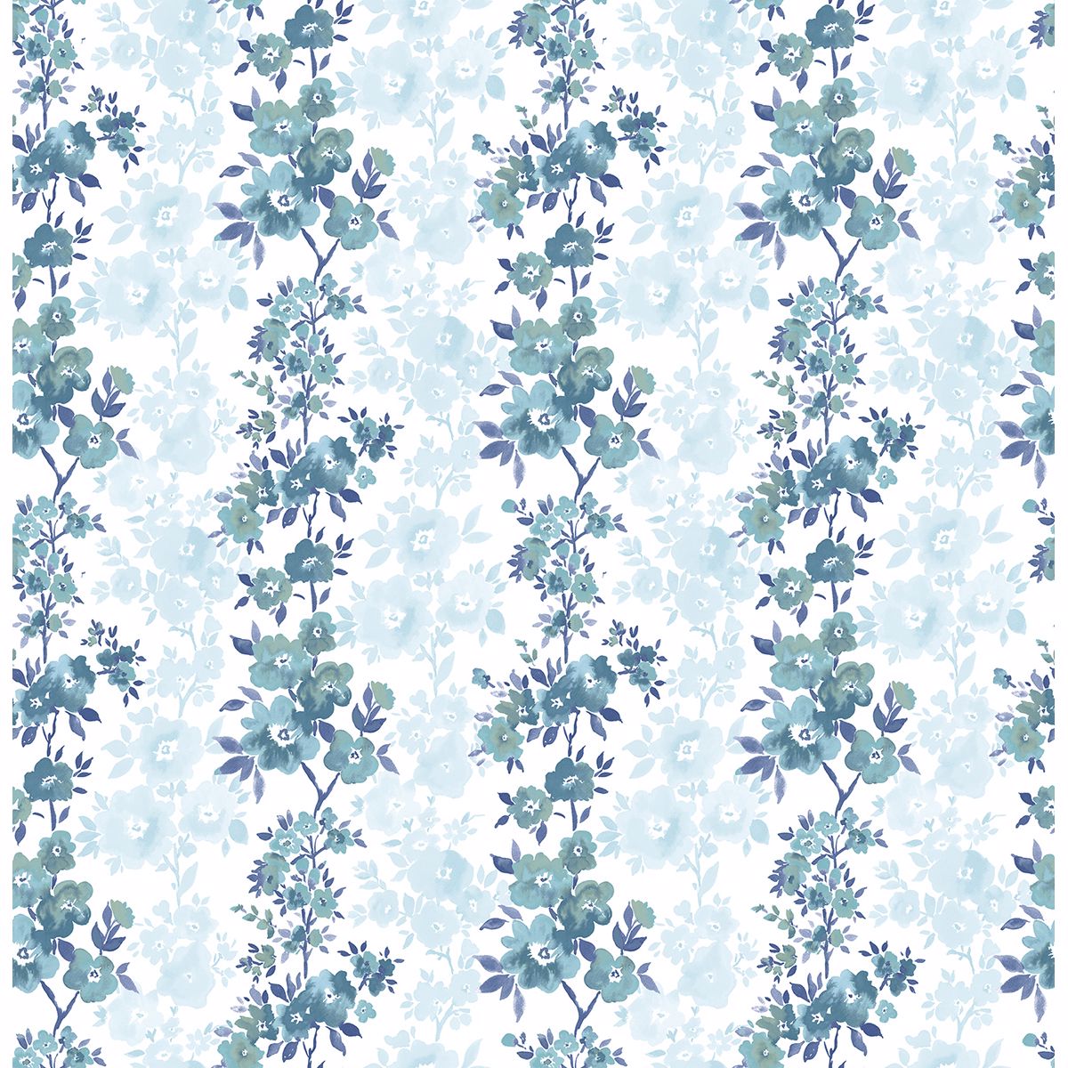 Light blue, navy, and teal combine in a medley of watercolor patterns to make this gorgeous floral stripe wallcovering. These high and low colors give this pattern an unparalleled depth.