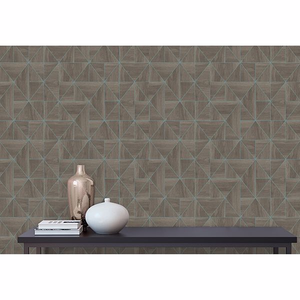 Esteemed and refined, this wood inspired wallpaper has a modern flair. A shimmering blue geometric pattern effortlessly complements a rich brown background, while raised inks lend to its realistic look. Cheverny is an unpasted, non woven wallpaper.