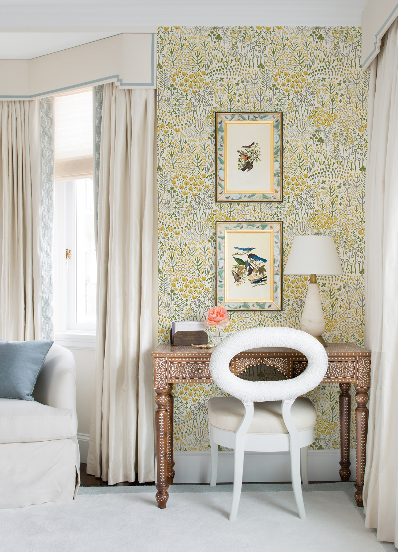 Delight in the whimsical and lighthearted stylings of this botanical wallpaper. Playfully illustrated in golden-yellow, grey, and green, a field of wildflowers bursts into bloom along a white backdrop. Chilton is an unpasted, non woven wallpaper.