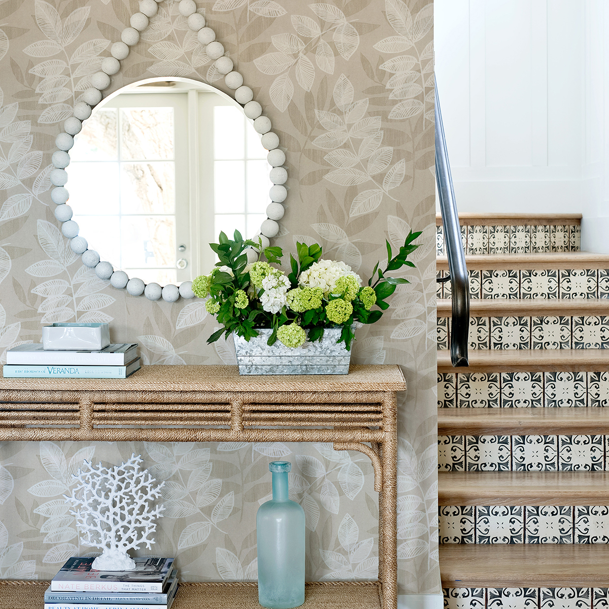 One large-scale leaf prints dance across another in dimensional white flocking. Mica flecks give the champagne background a metallic glow for a boho-glam twist. Chimera is an unpasted, non woven wallpaper.