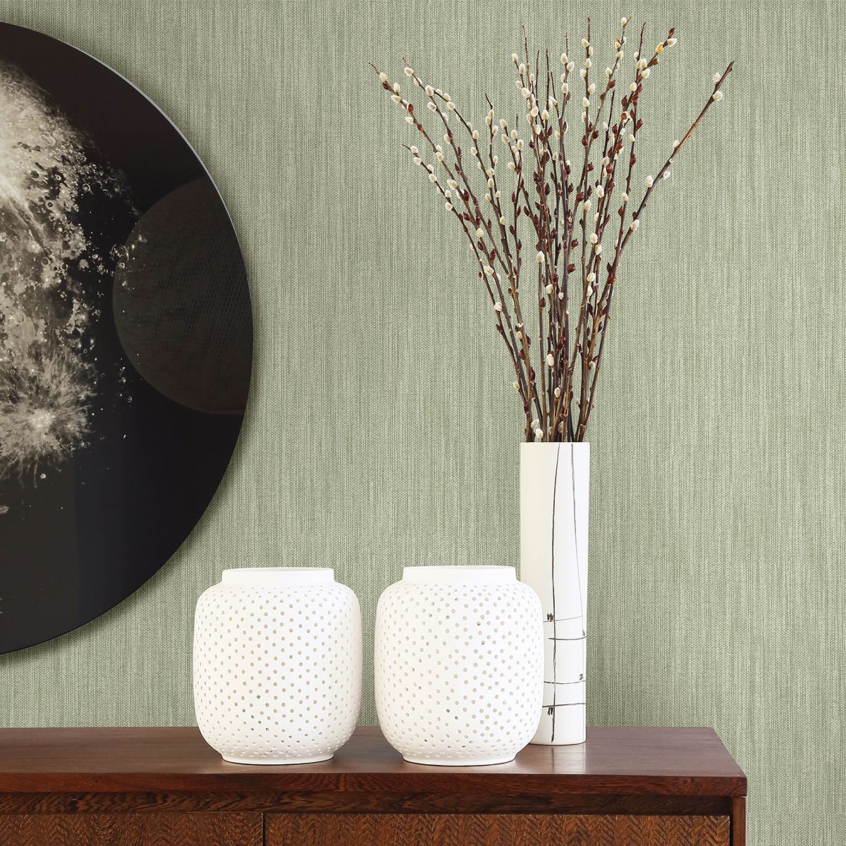 With sage and light grey hues, this faux linen wallpaper has a fresh energy. Its tightly woven design is complete with raised inks. Chiniile is an unpasted, non woven wallpaper.