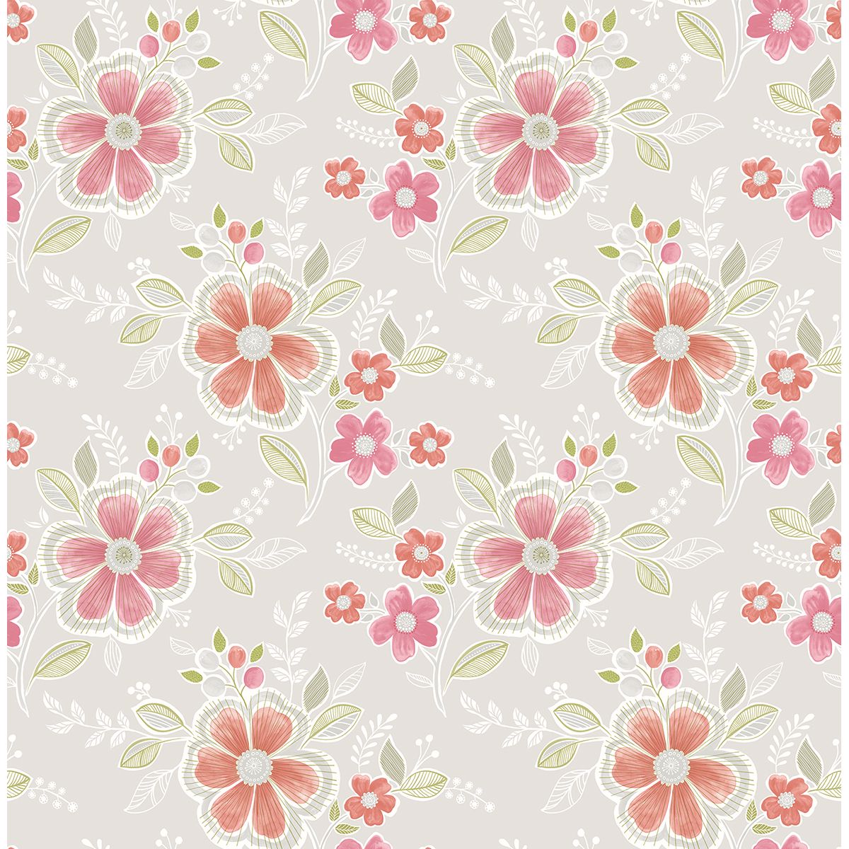 Bright shades of pink rose, peach, and fern flow delightfully across a pale grey background that provides the perfect subtle contrast.