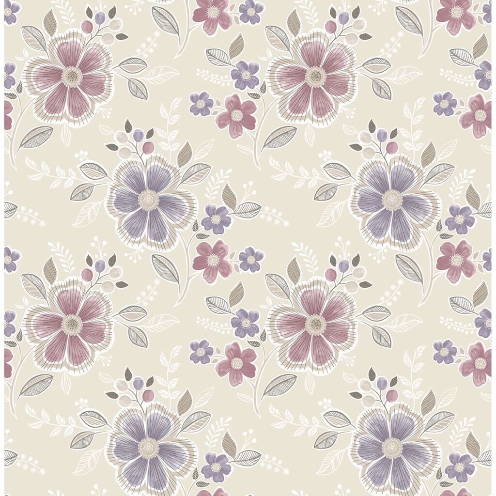 A muted jewel toned color palette shines in this floral wallpaper. Shades of midnight purple and muted magenta contrast with forest green leaves and a taupe background.