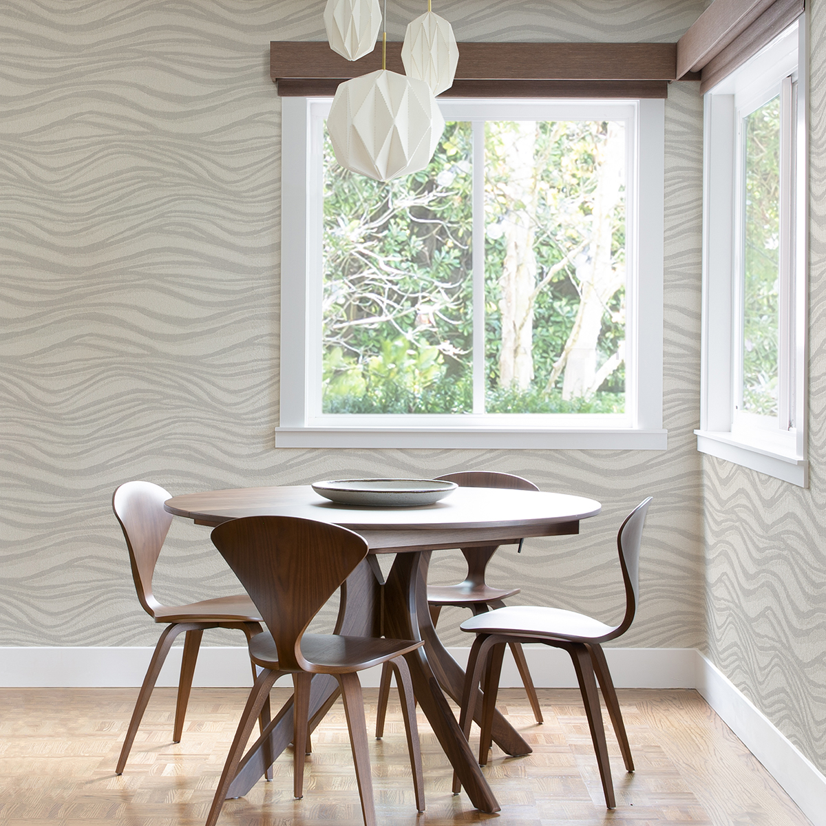 Bring motion and luxurious finishes to your walls. The neutral waving stripes are accented with glitter against a shimmering backdrop. Chorus is an unpasted, non woven wallpaper.