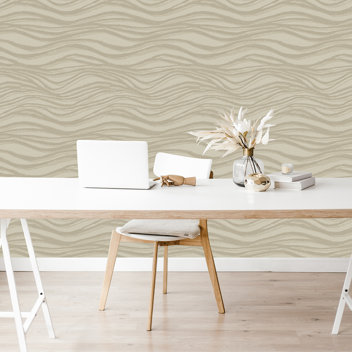 Modern luxury has never been so alluring. The golden waves are accented with glitter against the warm metallic backdrop. Chorus is an unpasted, non woven wallpaper.