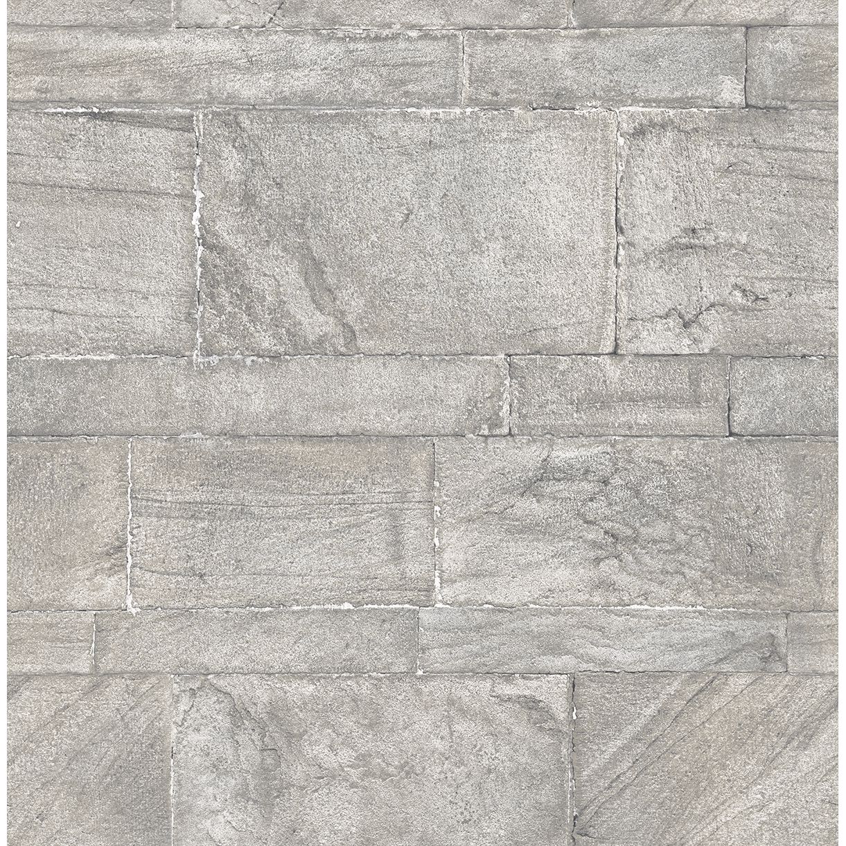 Classic sandstone is given a modern update with metallic silver. This faux stone wallpaper adds a rustic touch to a home. Features raised inks for realistic detail.