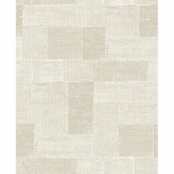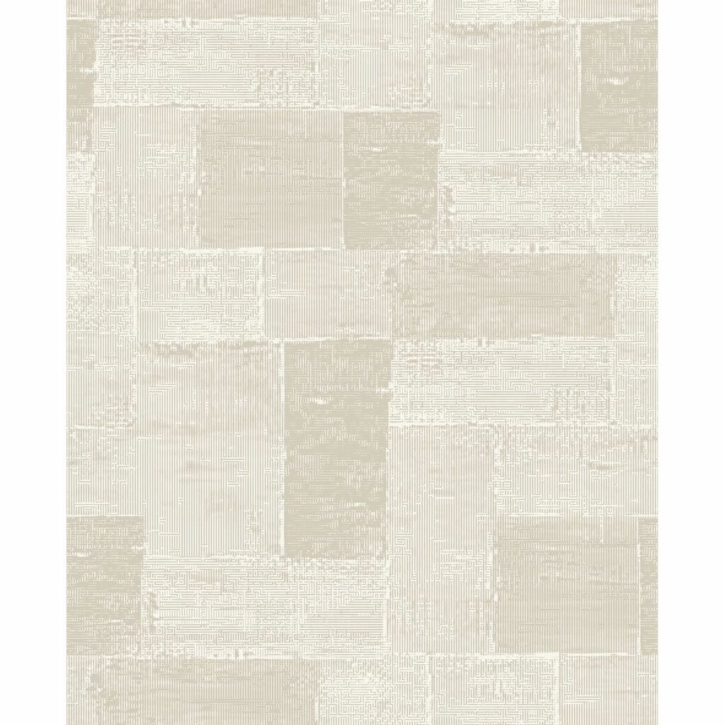 A champagne background shimmers beneath a white patchwork pattern. Its textured, distressed design and Greek key inspired pattern create a lovely bohemian wallpaper. Composition is an unpasted, non woven wallpaper.