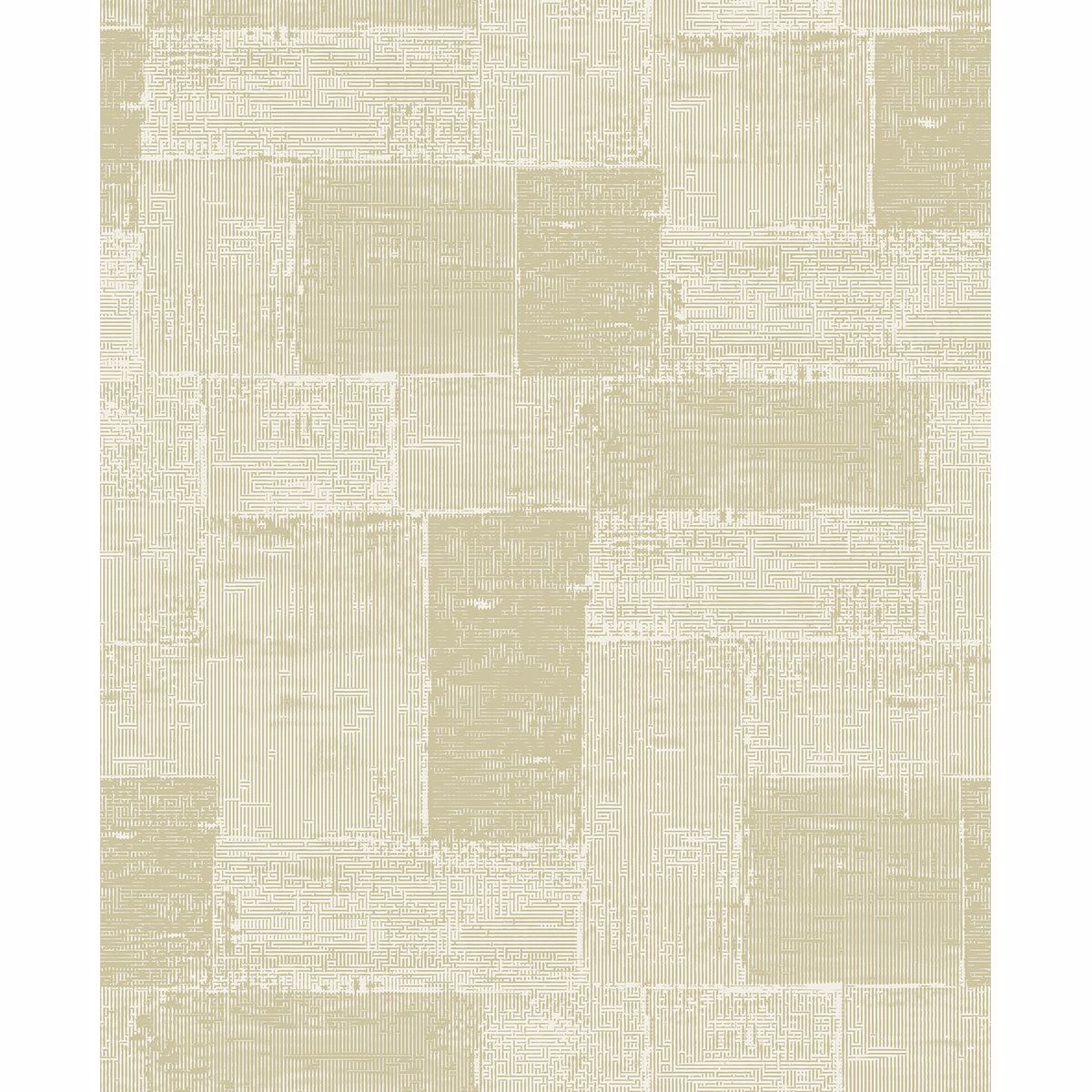 A white patchwork pattern effortlessly complements a shimmering gold background in this boho chic wallpaper. Its distressed design is accented by raised inks and Greek key details. Composition is an unpasted, non woven wallpaper.