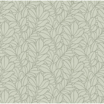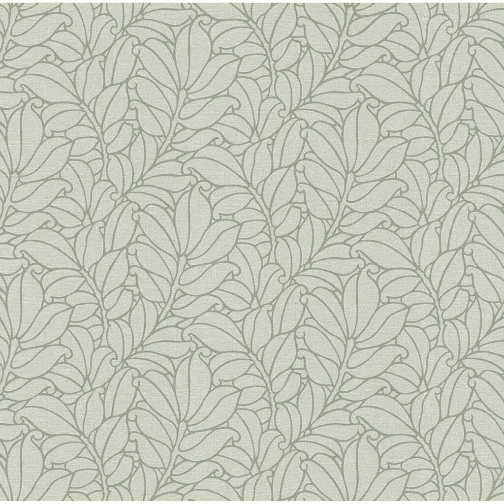 This botanical wallpaper is perfectly balanced between playful and elegant. Stems of round, curling leaves are outlined in light green against a sage faux linen backdrop. Coraline is an unpasted, non woven backed vinyl wallpaper.