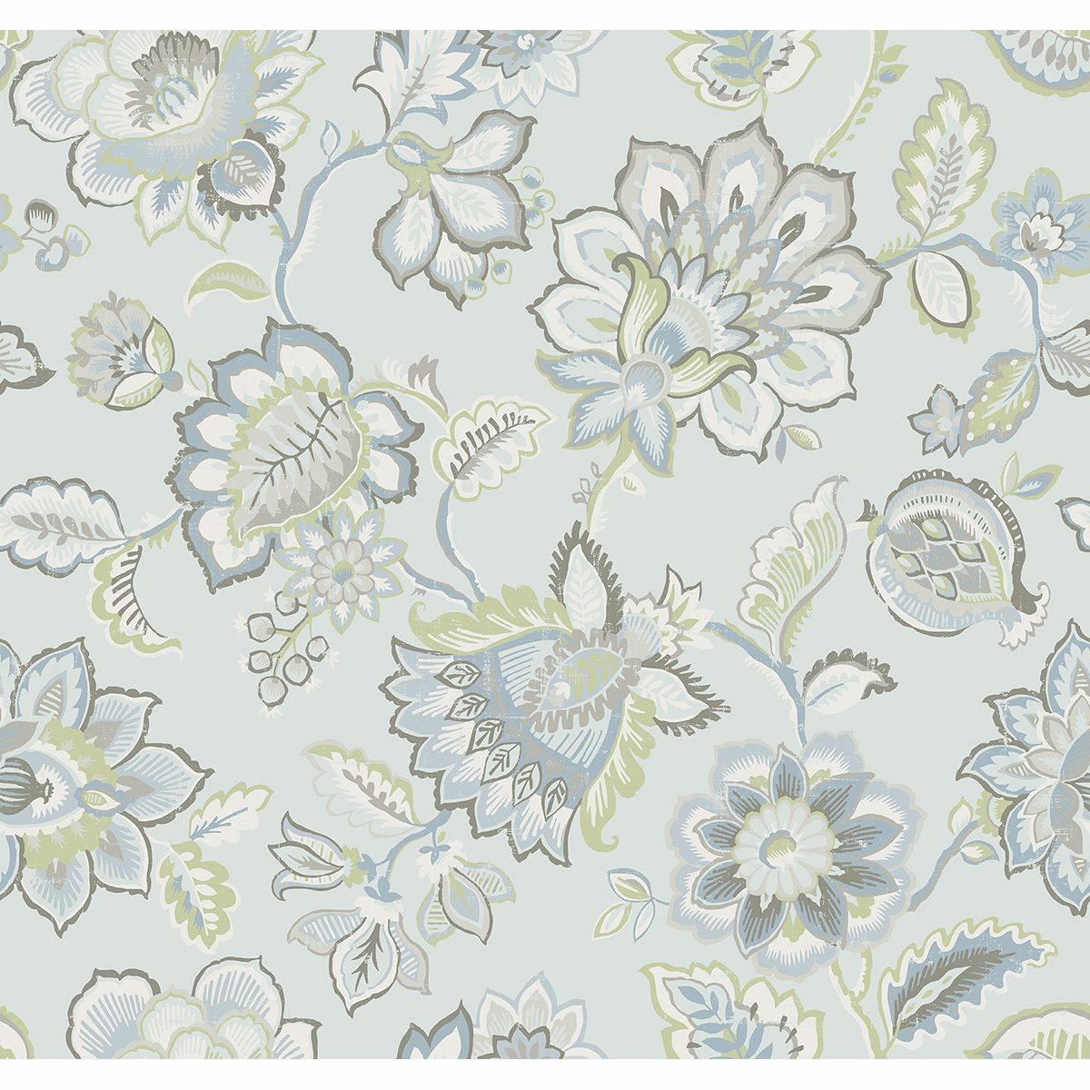 Beautiful Jacobean flowers blossom against an icy blue background in this lovingly weathered design. A palette of grey, green and brown hues will complement a variety of spaces. Corona is an unpasted, non woven wallpaper.