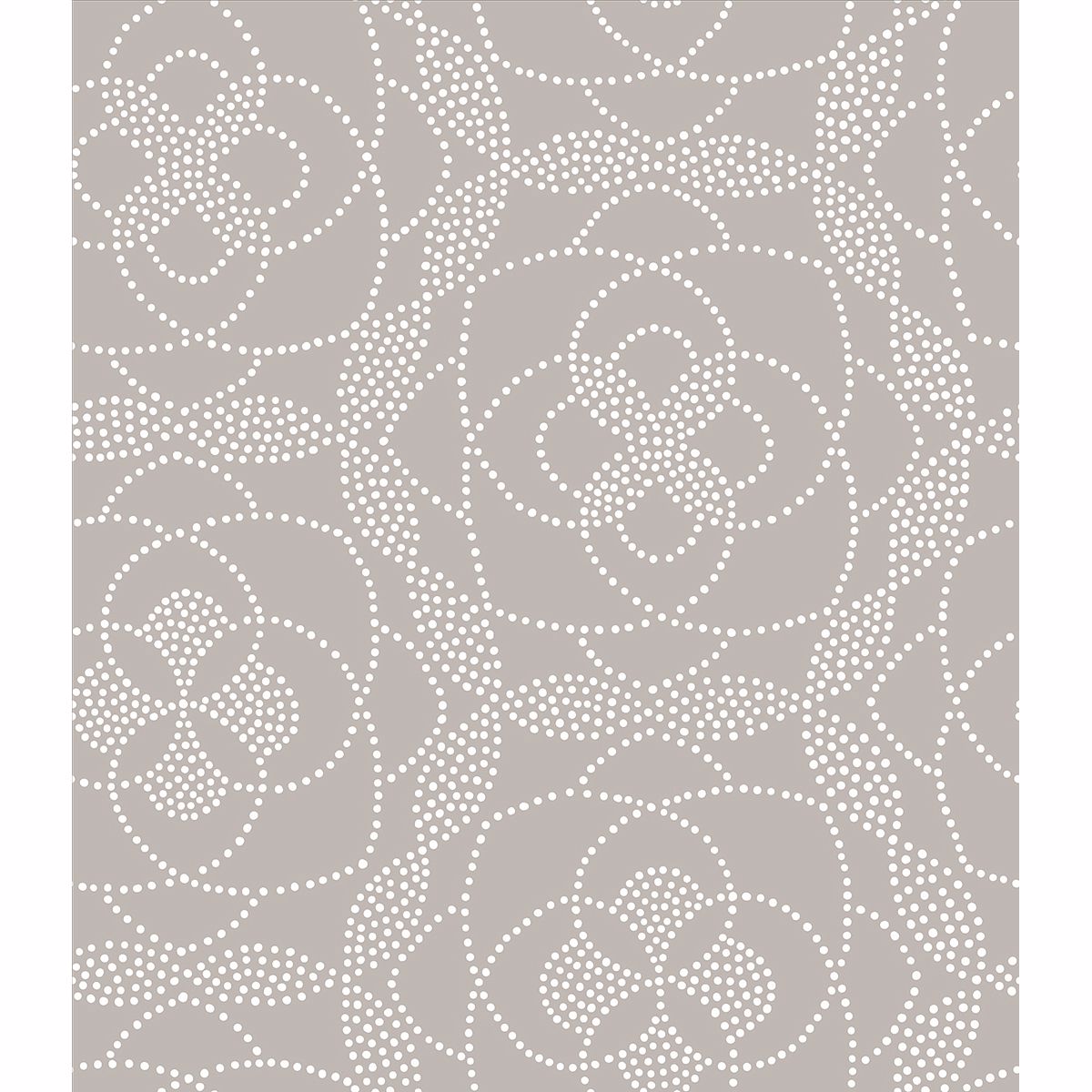 Elevate your walls with this chic dot print wallpaper. The modern flower print was inspired by henna mandalas. A grey background contrasts beautifully with silver pearlescent dots.