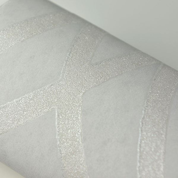 This wallpaper exudes subtle elegance. The white on white trellis design is accented with shimmering glitter. Coventry is an unpasted, non woven wallpaper.