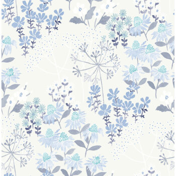 This charming floral wallpaper is a contemporary take on blue and white timelessness. Spring’s first blooms are painted in a variety of blues accented by white and framed by a pale grey backdrop. Cultivate is an unpasted, non woven wallpaper measuring 20.5 inches wide by 33 feet long, covering approximately 56.4 square feet per roll.