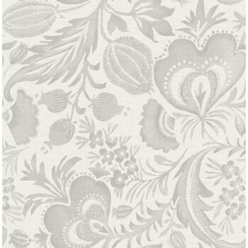 Enjoy timeless elegance with this botanical wallpaper. The leafy scrolls and floral blooms appear to be printed in shades of light grey along an off-white linen backdrop. Culver is an unpasted, non woven wallpaper measuring 20.5 inches wide by 33 feet long, covering approxiamately About 56.4 square feet square feet per roll