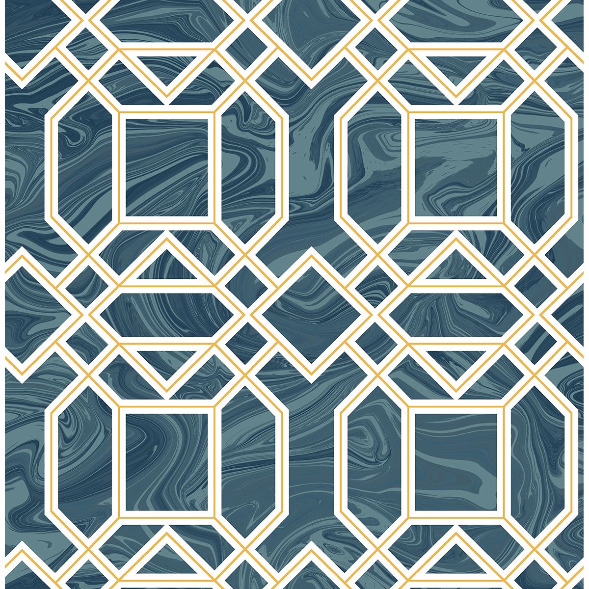Reminiscent of the swirling ocean, this blue marble wallpaper is a show stopper. A gold accent along the trellis pattern lends modern and chic flair. Daphne is a non woven, unpasted wallpaper.
