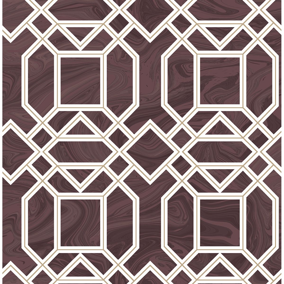A downright mesmerizing wallpaper. Swirling marble in maroon combines with a gold and white trellis pattern. Daphne is a non woven, unpasted wallpaper.