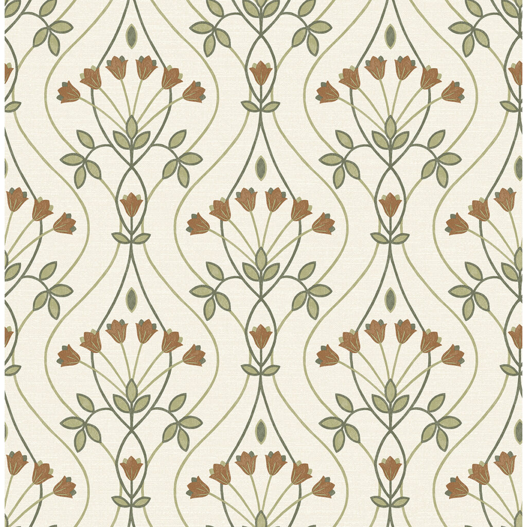 Brighten your home with the simple charms of this floral design. Curving green lines form an ogee frame that’s embellished by stylized red tulips. Dard is an unpasted, non woven wallpaper.