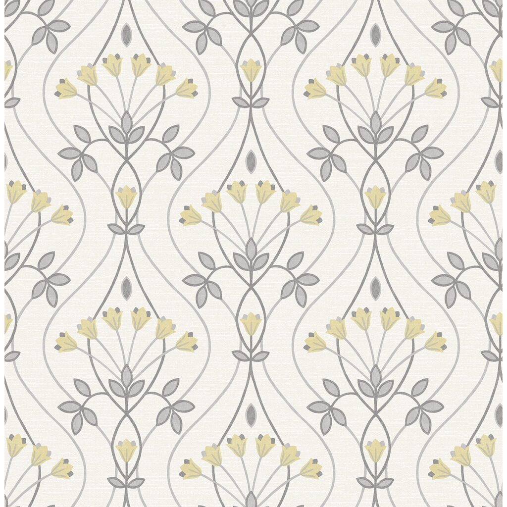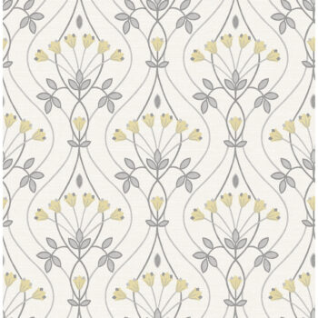 This simple floral ogee design will add cheerful charm to your interiors. The grey, curving lines are decorated with bunches of yellow stylized tulips, the color palette adding to the design’s quaint appeal. Dard is an unpasted, non woven wallpaper.