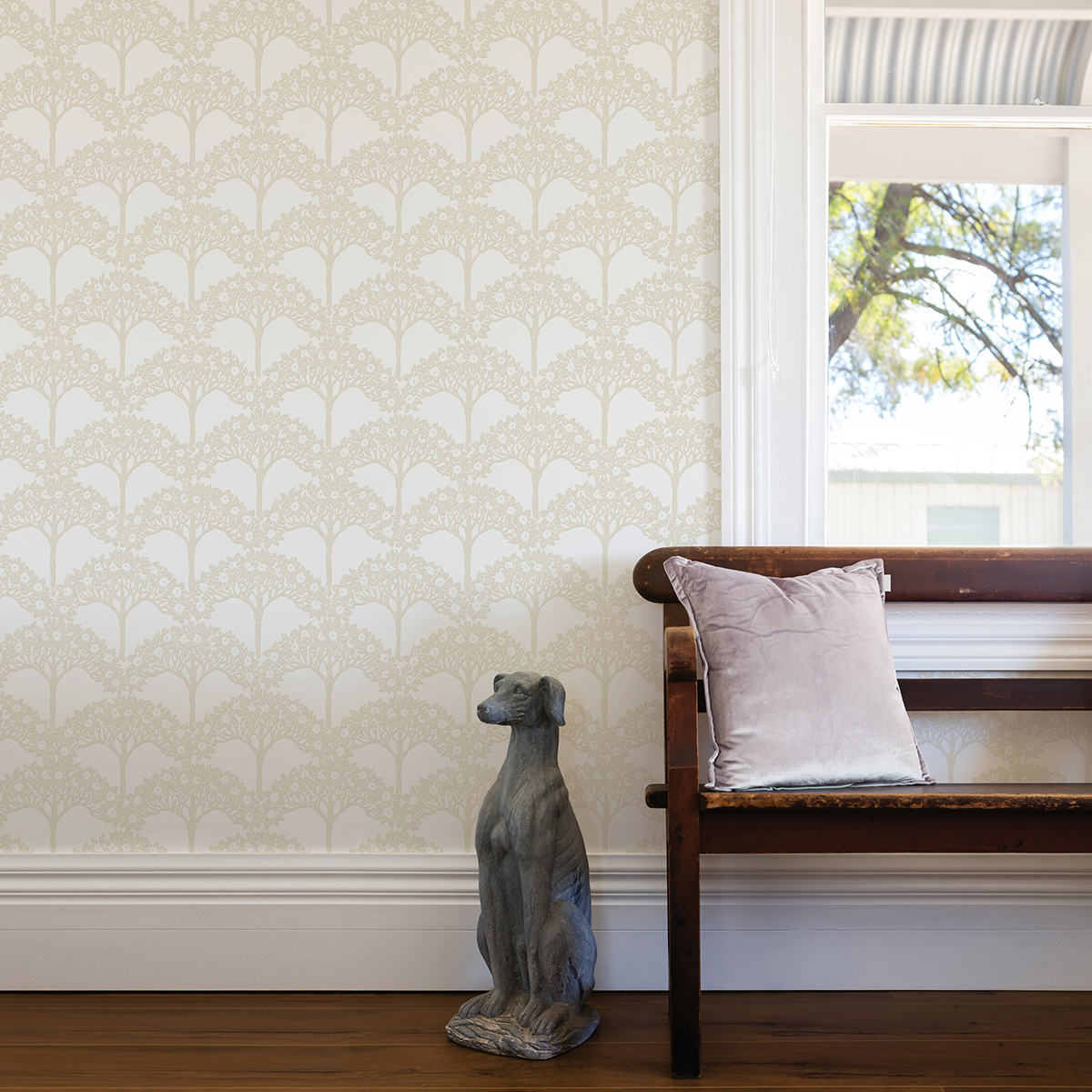 Bring architectural elegance to your walls with this gorgeous trees design. The forested columns of flowering beige trees adds an air of fine craftsmanship to any home. Dawson is an unpasted, non woven wallpaper.