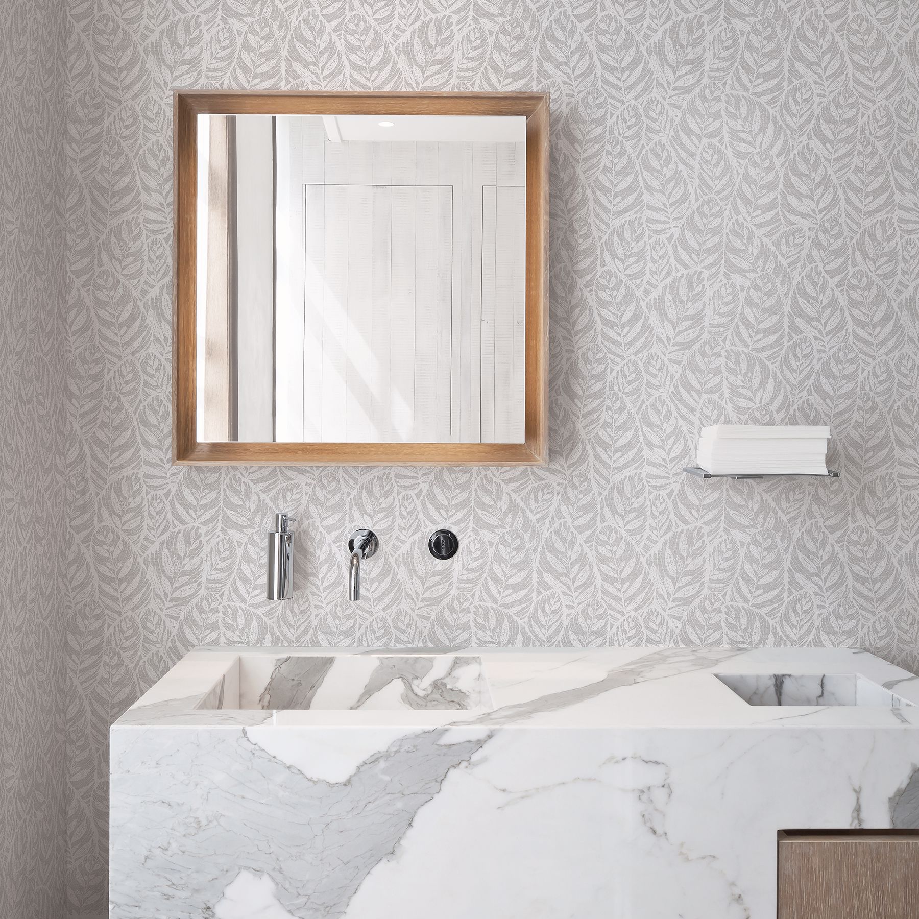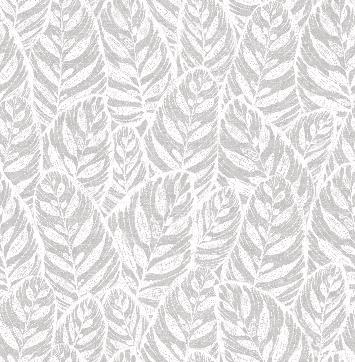 A chic take on a botanical print, this wallpaper has a classic color palette. The grey distressed backdrop accentuates the bold white leaves, lending to its contemporary style. Del Mar is an unpasted, non-woven wallpaper.