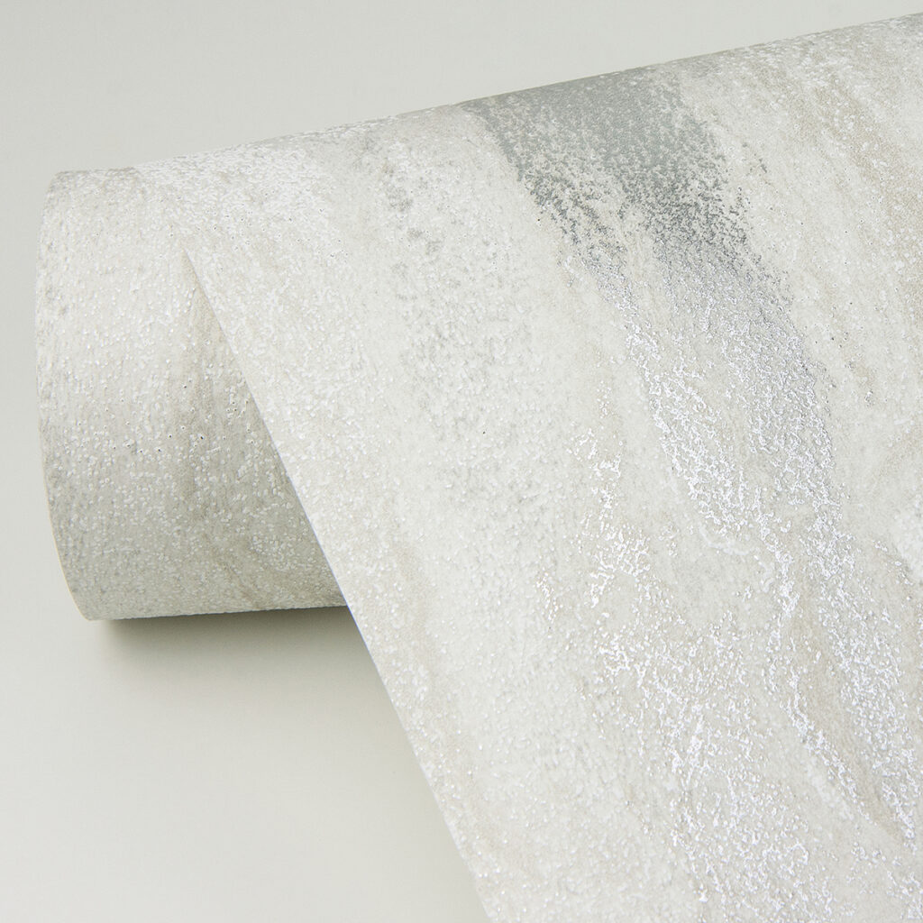 The natural beauty of marble is enhanced with metallic glamour in this textural wallpaper. Vertical striations of swirled cream, taupe and grey are infused with delicate raised ink texture and stripes of metallic silver. Delesse is an unpasted, foil on non woven wallpaper.