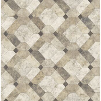 A contemporary addition to your home. Large-scale shapes designed to resemble marble tiles are arranged in a hexagonal pattern. Metallic silver lines outline the neutral beige and brown tiles.
