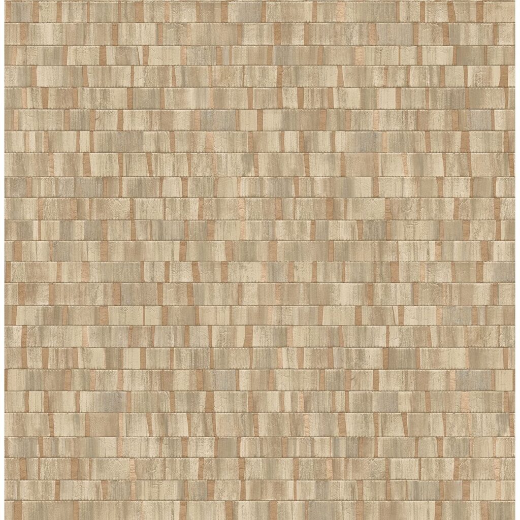 Add warmth and dimension to walls with this exquisite copper wallpaper. Its geometric pattern features distressed beige rectangles and raised inks. Dobby is an unpasted, non woven wallpaper.