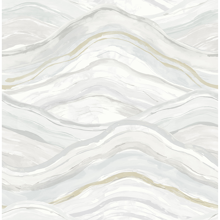 This soothing abstract design is reminiscent of ocean waves. The flowing bands of pale grey, powder blue, and light teal are accented by thin strips of pearlescent silver. Dorea is an unpasted, non woven wallpaper.