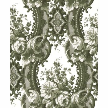 Dream big with this old world inspired wallpaper that is lovely and eclectic. The green and sage floral damask has white details surface printed for added texture. Dreamer is a non woven, unpasted wallpaper.