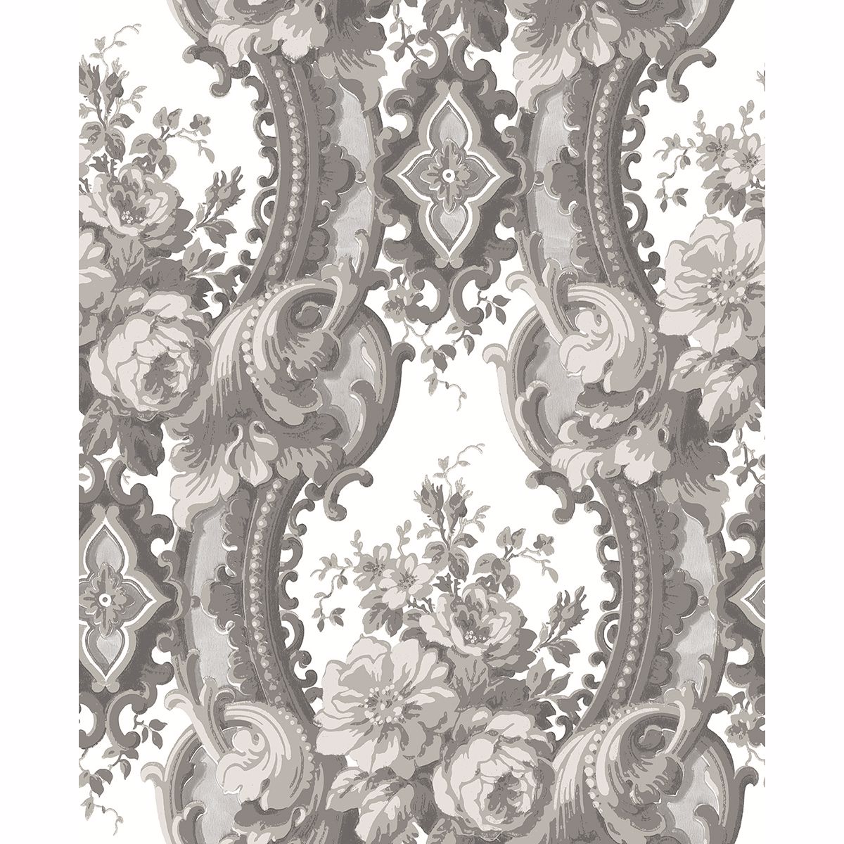 A large-scale floral damask that has hints of old world elegance with modern intrigue. Surface printing adds texture to the tonal grey pattern. Dreamer is a non woven, unpasted wallpaper.