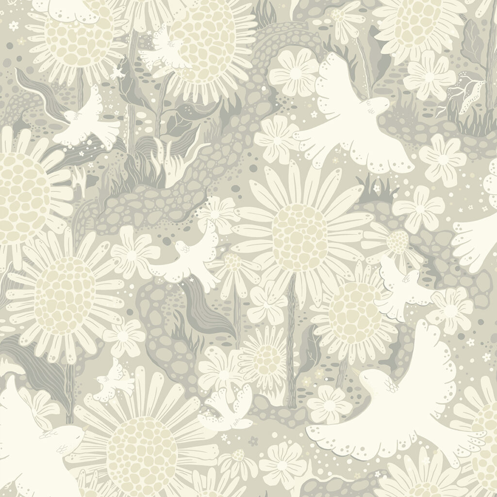 This dreamy bird wallpaper is perfect for bringing additional serenity to your interiors. The songbirds soar above a field of fantastical sunflowers, the whole scene depicted in white, soft grey, and delicate blue. Drömma is an unpasted, non woven wallpaper.