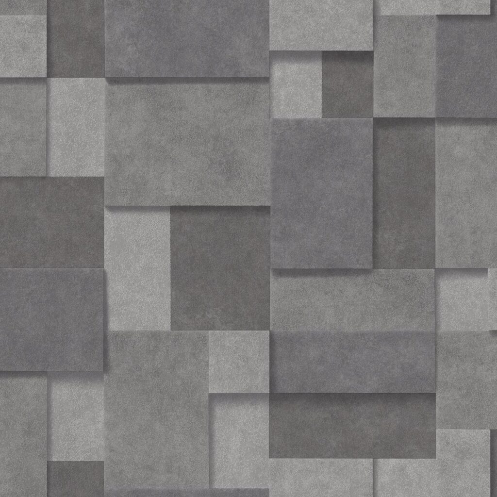 Glamorous and contemporary, this shimmering geometric wallpaper has the look of stacked stones. Realistic shading and raised inks lend to its 3D effect while shades of dark grey add a moody edge. Duchamp is an unpasted, non woven wallpaper.