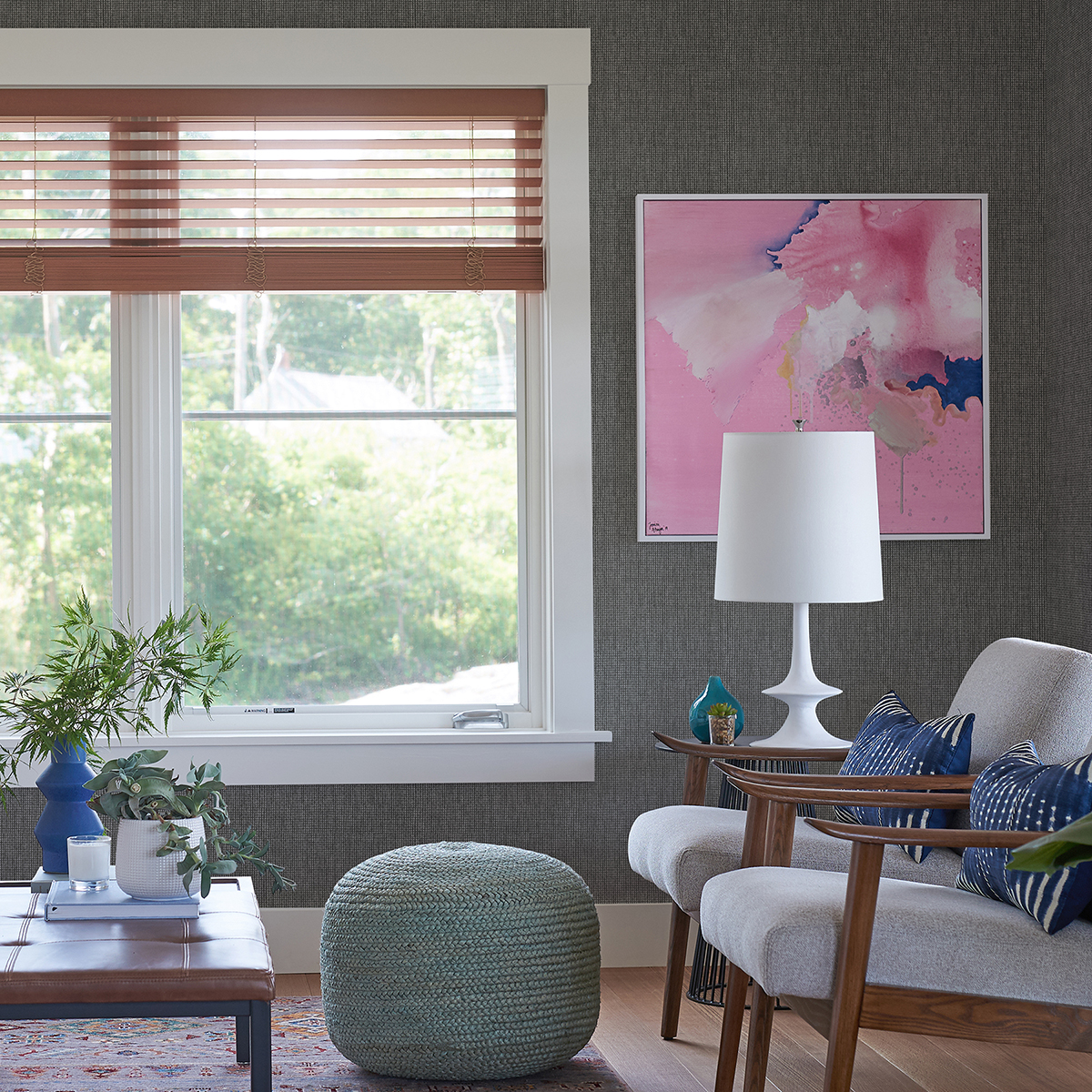 Add earthen sophistication to your walls with this basketweave wallpaper. Strips of grey and black are laced together to create a dimensional look, accented by a subtle silvery finish. Dunstan is an unpasted, non woven backed vinyl wallpaper.