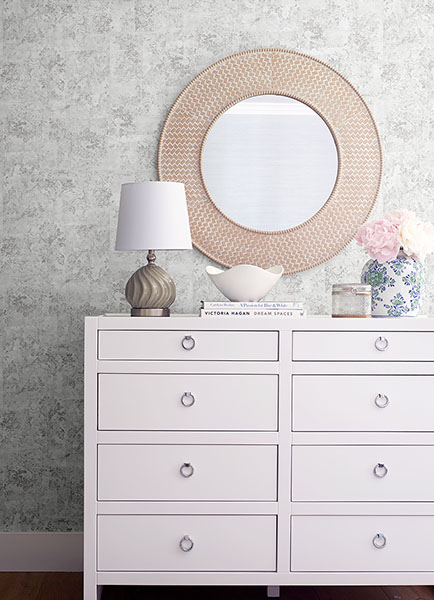 Add textural splendor to your walls with this abstract botanical wallpaper. The mottled white and light grey backdrop has a subtle patchwork look, which is then overlaid with dark grey botanical silhouettes imbued with a silvery sheen. Eisen is an unpasted, foil on non woven wallpaper.