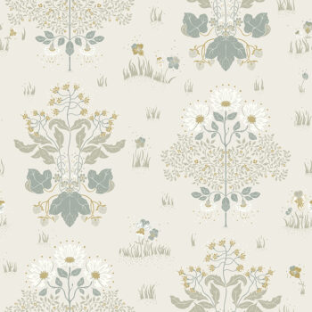 This welcoming floral design will bring old world charm to your interiors. Two floral groupings are painted in blue, grey, golden yellow and white: one featuring daises accented by tiny buttercups, the other a collection of petite wildflowers and ripe berries. Elda is an unpasted, non woven wallpaper.