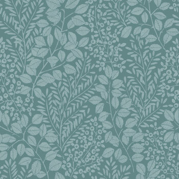 This two-tone botanical wallpaper perfectly captures the tranquility of the forest. Twining branches filled with plump leaves and ripe berries are inked in white along a light blue backdrop. Elin is an unpasted, non woven wallpaper.