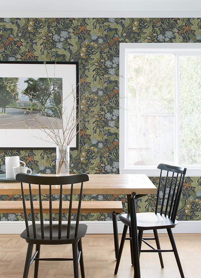 This moody and majestic Art Nouveau floral wallpaper adds wild elegance to your walls. A variety of red, light blue, white, and golden yellow blooms grow among twisting, leafy green vines, all richly offset by an indigo backdrop. Elise is an unpasted, non woven wallpaper.