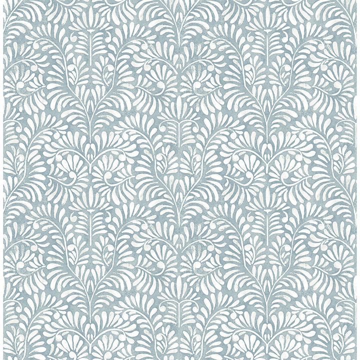 The rustic elegance of this botanical design adds instant charm to your interiors. The unfurling fiddlehead ferns are inked in cream along an antique blue background. Elma is an unpasted, non woven wallpaper.