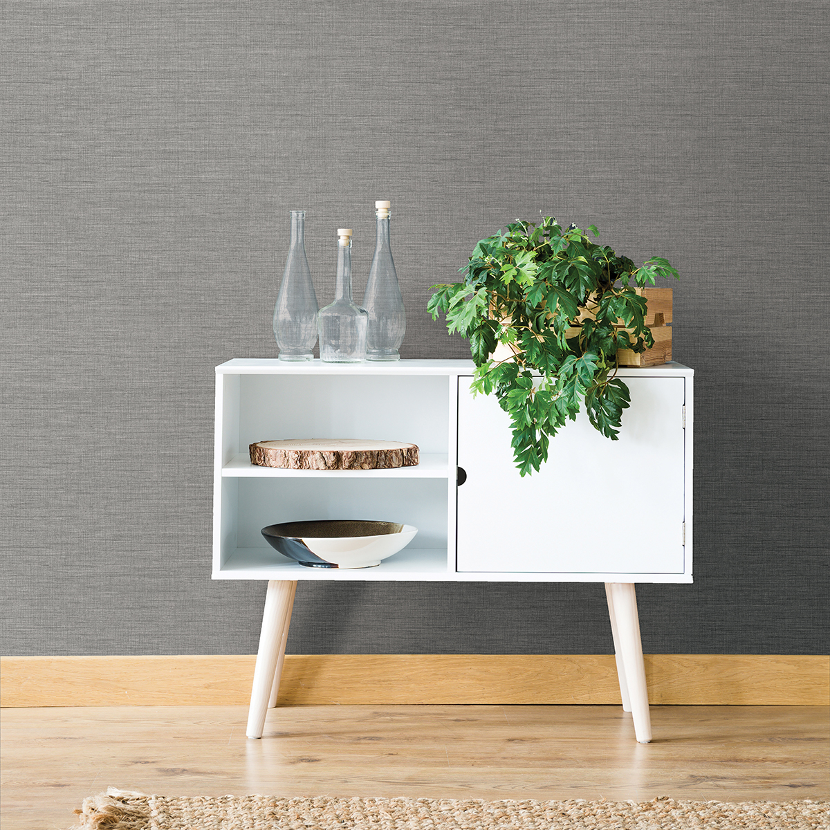 Create a dimensional look with this grey linen inspired wallpaper. Its textured design is accented by woven details and cream undertones. Essence is an unpasted, vinyl wallpaper.