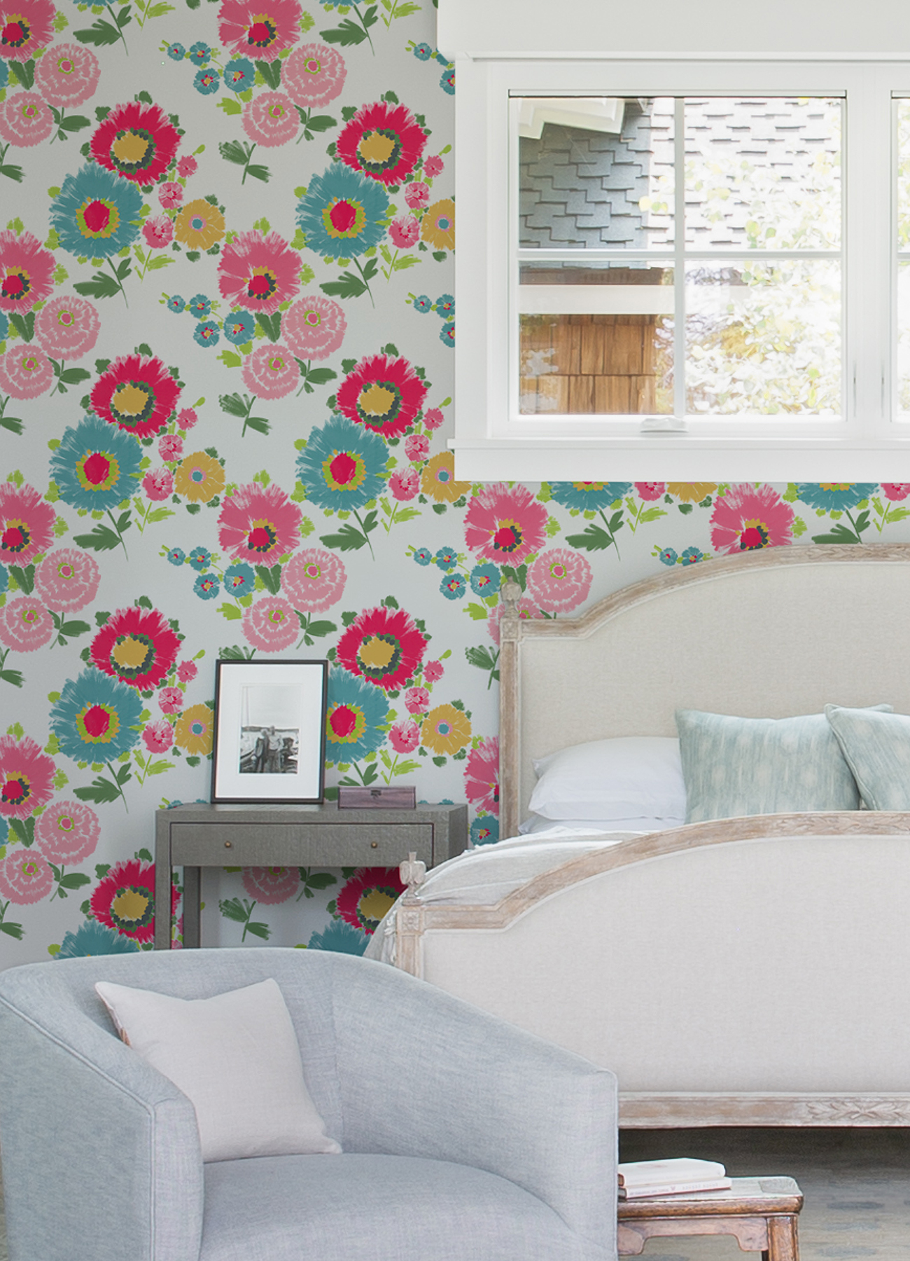 Wrap your walls in the cheerful exuberance of this artistic floral wallpaper. The large blooms are expressively painted in an array of teal, pink, and red hues along a soft white background. Essie is an unpasted, non woven wallpaper.