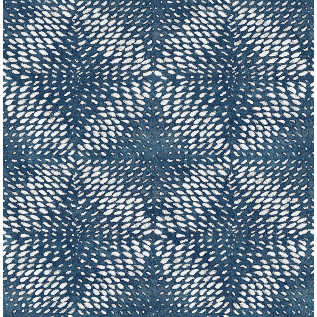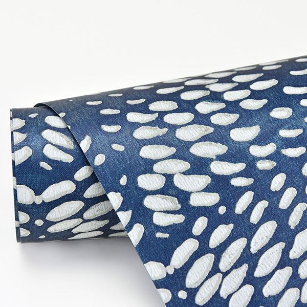 Utterly mesmerizing, this abstract wallpaper is a brilliant shade of blue. The sapphire background shimmers with mica flecks beneath the raised ink pattern in white and dove grey. Ethos is an unpasted, non woven wallpaper.