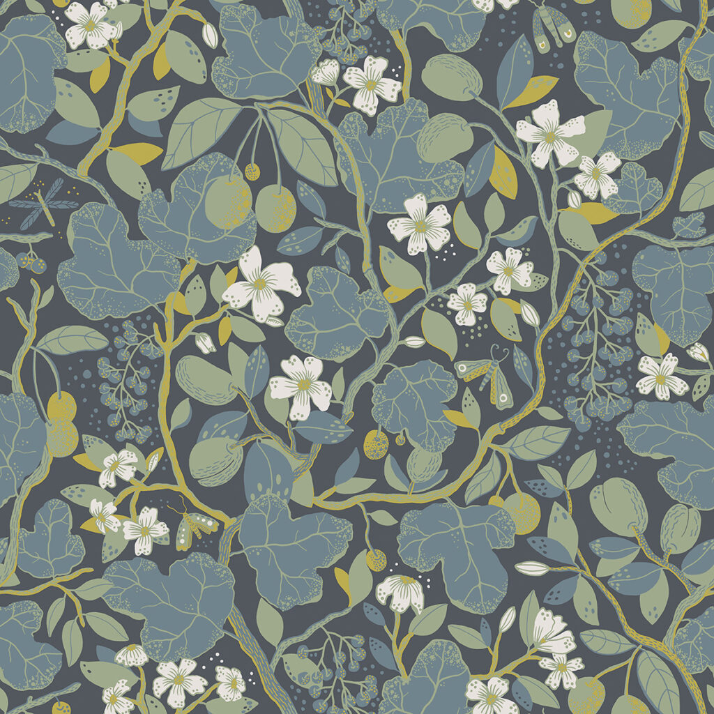 Enjoy the rich bounty of the earth with this moody botanical wallpaper. The blue and green garden vines are loaded with ripening fruit and surrounded by yellow flowering vines with white blooms and blue berries. Ewald is an unpasted, non woven wallpaper.