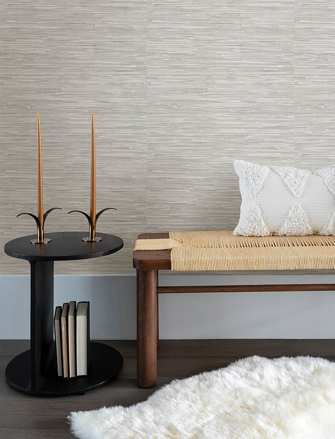 With wide strands and prominent raised ink stitching, this faux grasscloth is a replica of high-end, knotted grasscloth. A cool blend of grey hues adds to its timeless elegance. Exhale is an unpasted, non woven wallpaper measuring 20.5 inches wide by 33 feet long, covering approximately 56.4 square feet per roll.