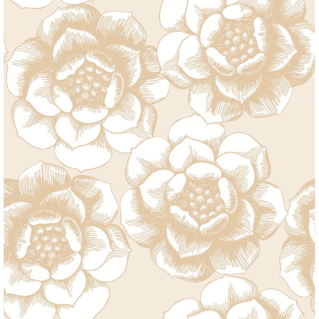 A high impact wallpaper that dazzles. Large-scale white and gold flowers bloom on a cream background. Fanciful is a non woven, unpasted wallpaper.