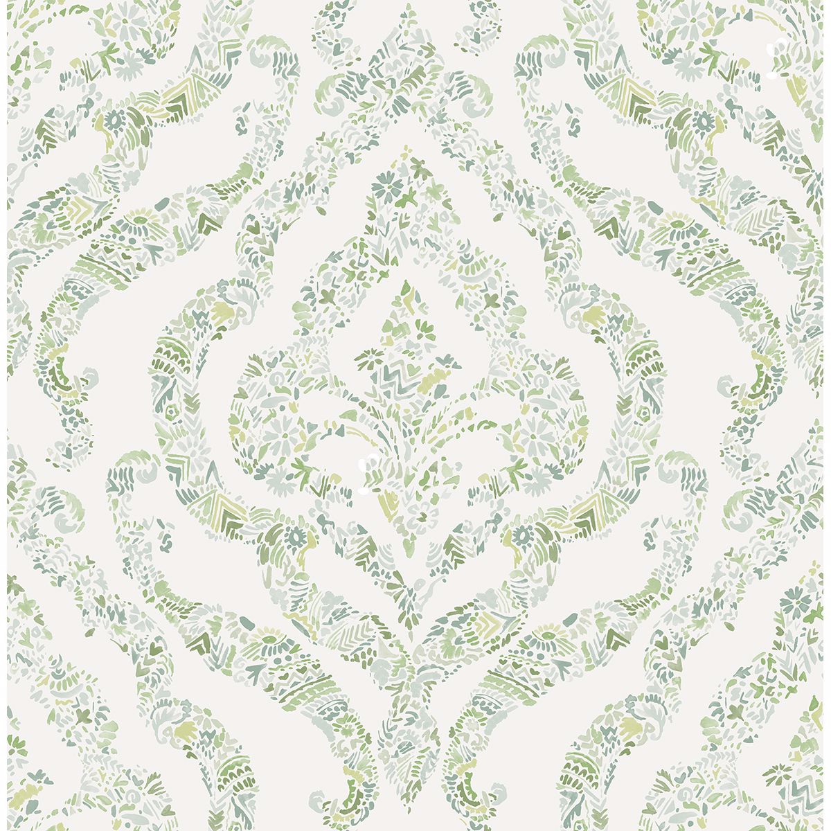 Embodying an organic chic style, this damask pattern is comprised of botanical details. Light and dark green hues effortlessly complement a crisp white background, while its watercolor design emphasizes its transitional style. Featherton is an unpasted, non woven wallpaper.