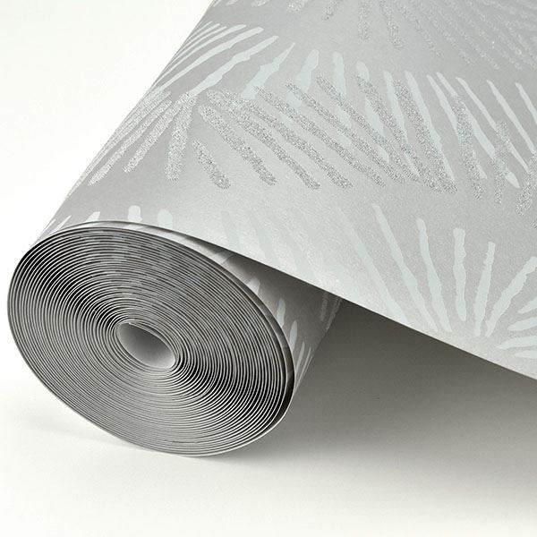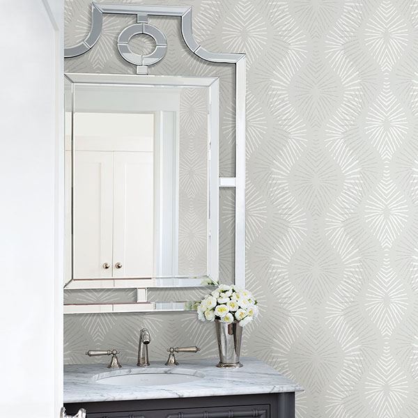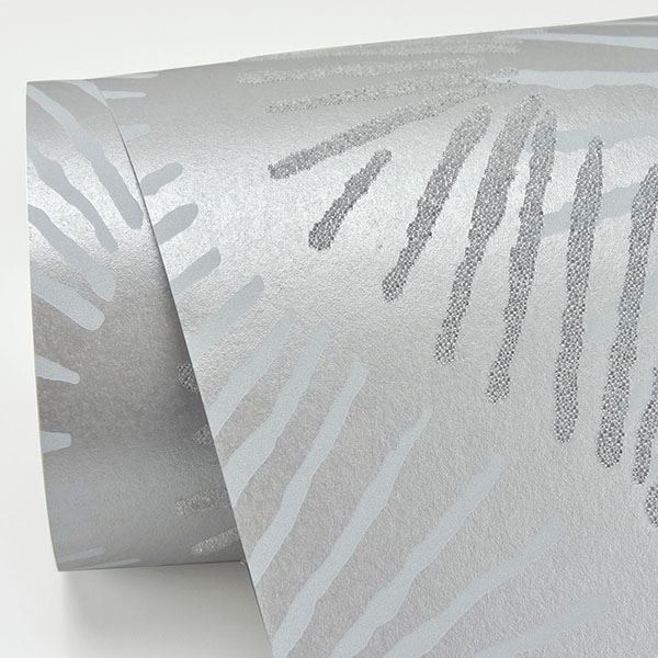 Exquisite clear beads and strokes of ice blue form an alternating ogee pattern. The metallic silver background shimmers in the light. Feliz is an unpasted, non woven wallpaper.