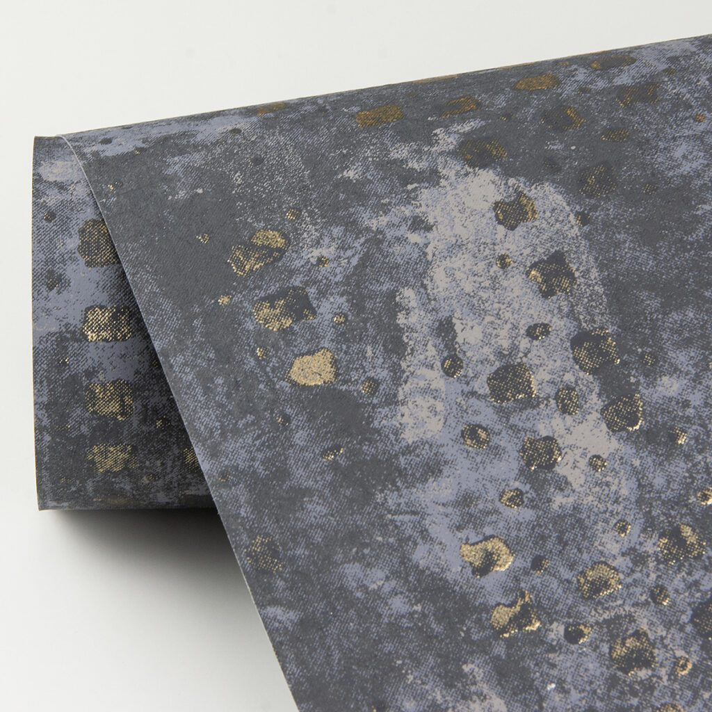 This geometric wallpaper marries sophisticated design with industrial appeal. A rich, steely blue and grey backdrop is studded with square blots of bronze raised inks with a subtle, matte metallic finish. Felsic is an unpasted, non woven wallpaper.