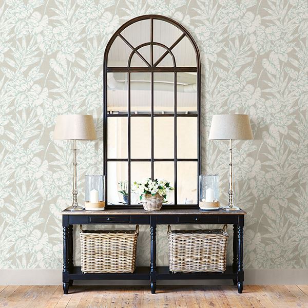 A floral wallpaper with a linen print background. This neutral design gets a pop of color with turquoise line work.