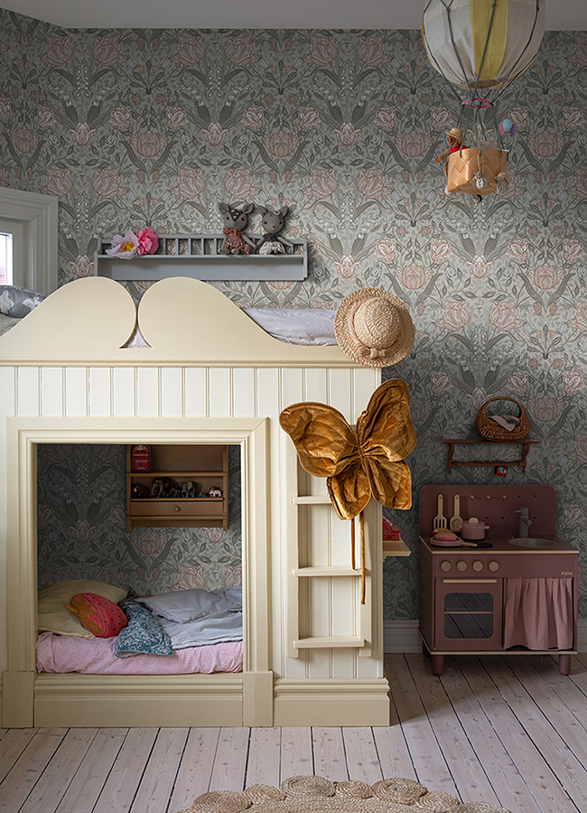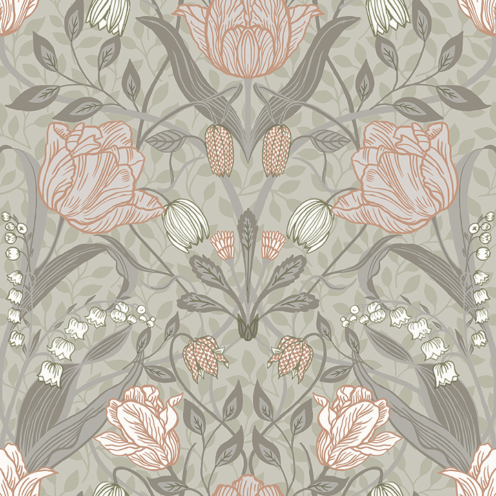 Enjoy the delicate beauty of garden blooms year-round with this gorgeous floral wallpaper. The Scandinavian-inspired design features twining pink and white tulips framed by a light grey backdrop imprinted with grey vines. Filippa is an unpasted, non woven wallpaper.
